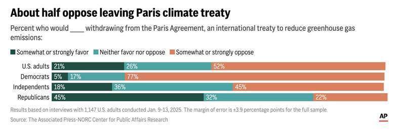 美联社今年1月的一项民调数据显示,约半数美国人反对退出《巴黎协定》,只有大约20%的美国成年人“有些”或“非常”赞成退出《巴黎协定》。前气候谈判代表、法国高级政策顾问保罗·沃特金森认为,美国若再次退出《巴黎协定》,可能会对全球应对气候变化努力造成更大破坏。